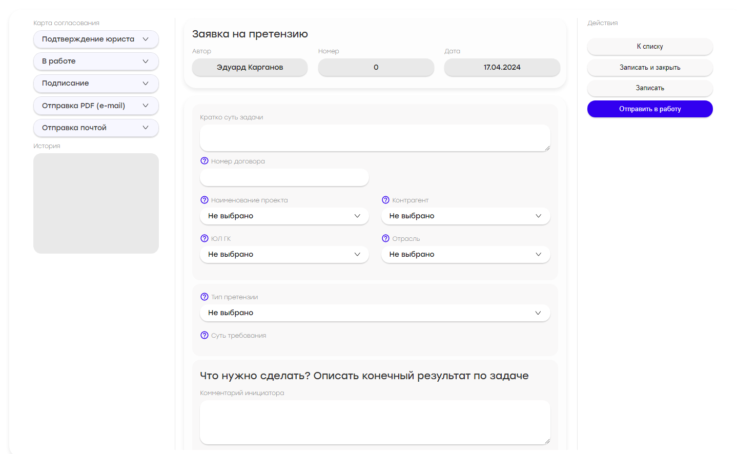 Ключевым преимуществом данного сервиса является возможность каждому сотруднику оформить заявку на претензионную работу. Начиная с указания всех необходимых данных, относящихся к объекту работы, контрагенту, направлению и сути претензии, инициатор также может прикрепить необходимые файлы.