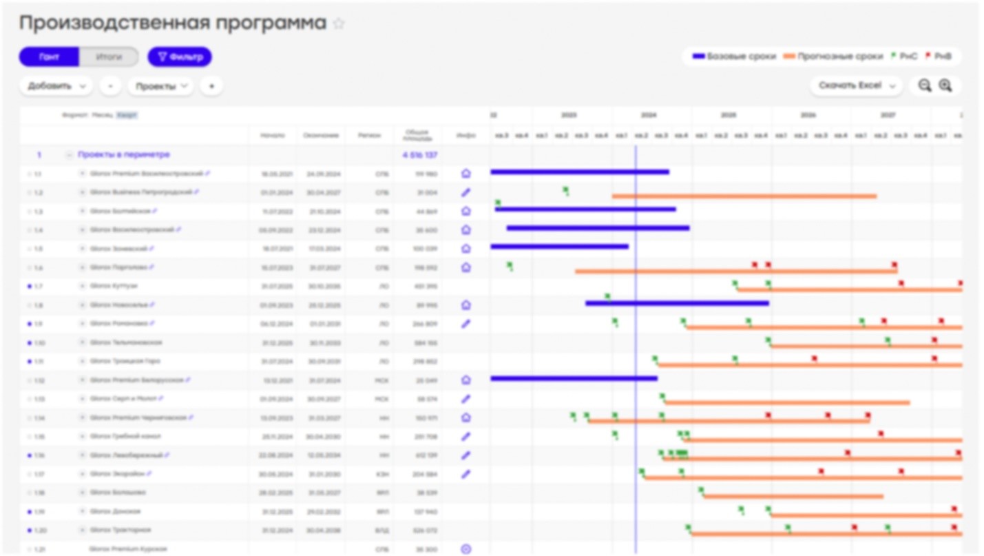 Функционал представляет собой таблицу с показателями по объемам и срокам строительства всех проектов компании.