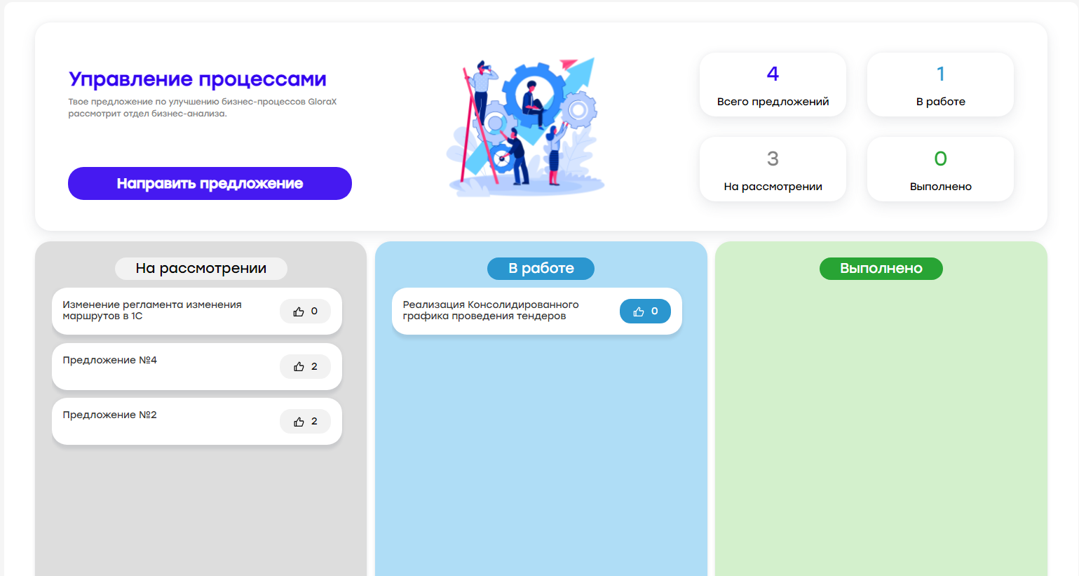 Суть сервиса заключается в том, что любой сотрудник компании может сделать предложение по улучшению бизнес-процессов. Для этого достаточно заполнить специальную форму, где необходимо описать суть предложения и подробно изложить свои идеи. После этого предложение отправляется на рассмотрение отделу бизнес-анализа, который принимает решение о его реализации.